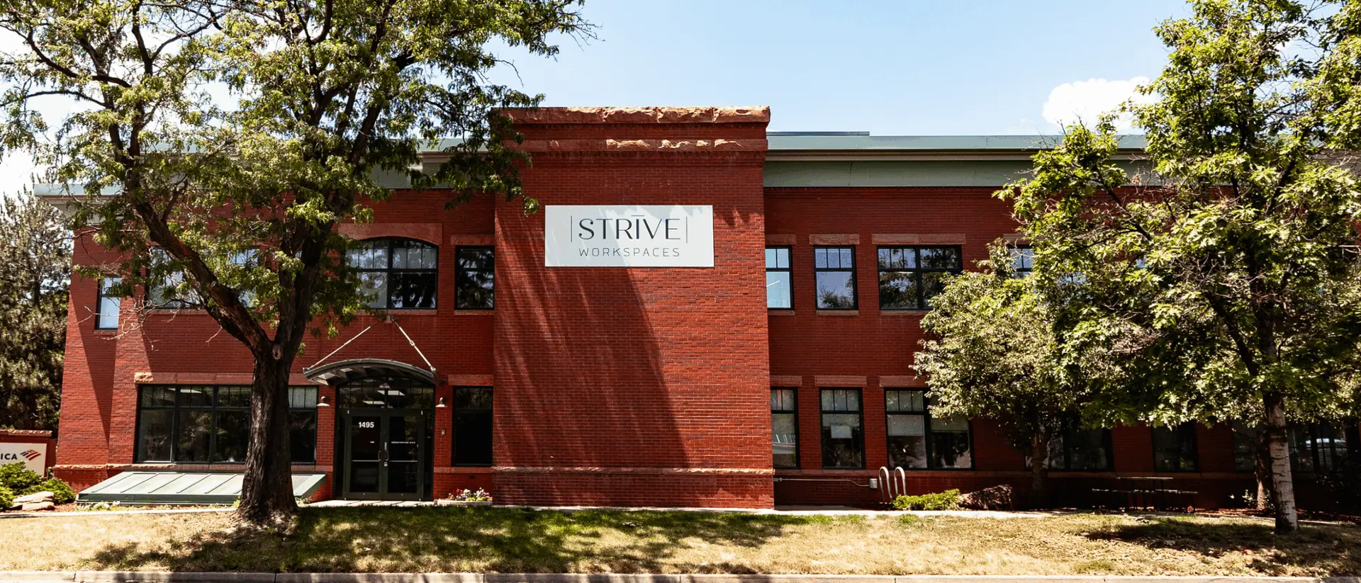 Person working on a laptop at a shared coworking table inside a modern Strive Workspaces office.