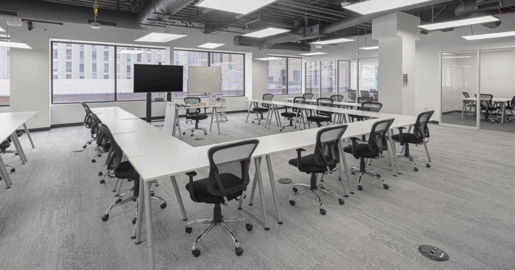 Host productive workshops and team sessions in a flexible room designed for training and learning.